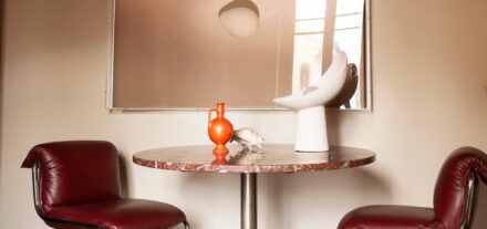 À esquerda, sobre um aparador, e à direita, em um pequeno terraço fechado. A luminária moderna refresca a decoração.